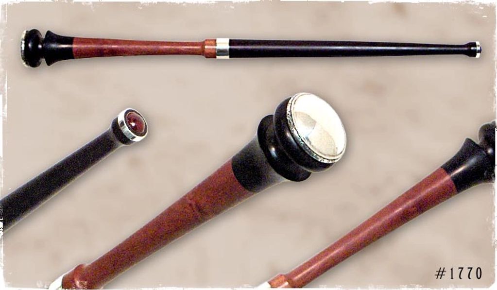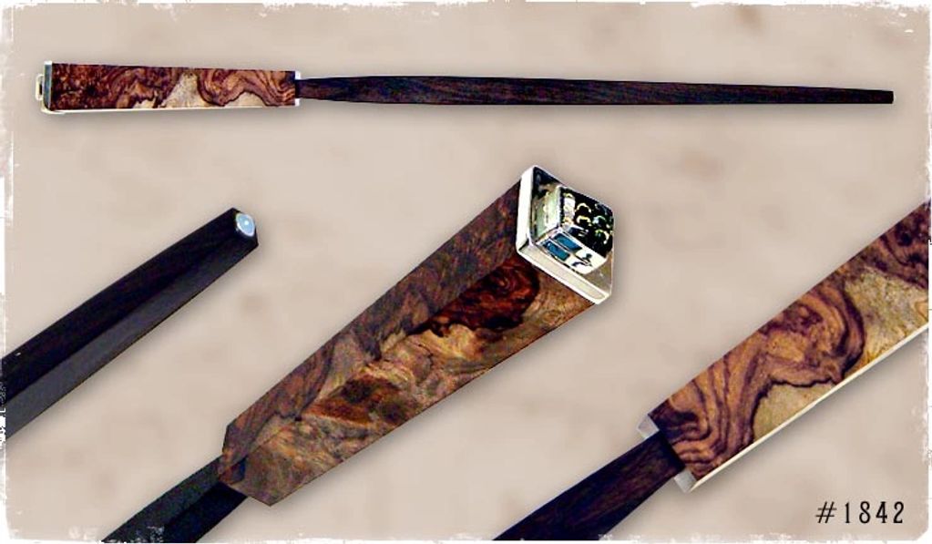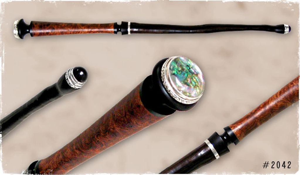 Endcap: Abalone with Quartz Lens / Handle: Ebony and Afzelia Burl / Shaft: Carved Ebony / Tip: Amethyst / Accents: St Silver