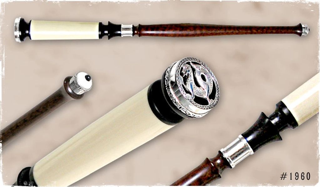 Endcap: St Silver Dragon by Jerry Gehringer / Handle: Ivoroid and Ebony / Shaft: Snakewood / Tip: Bone and Onyx / Accents: St Silver