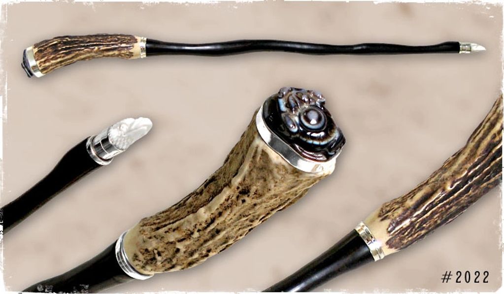Endcap: Tibetan Agate Frog Carving / Handle: Sambarstag Horn (Shed) / Shaft: Carved Blackwood / Tip: Bone Eagle Carving / Accents: St Silver